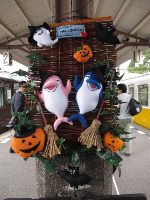 駅の改札で働くことちゃん、リーフは秋らしくハロウィンの様相に。